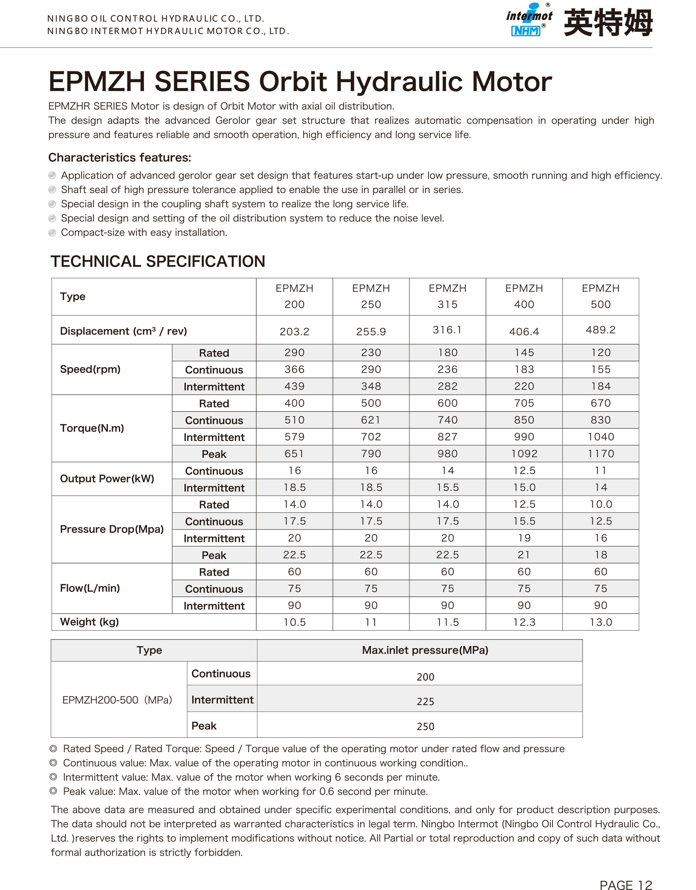 The following data are measured and obtained under specfic actual experimental conditions, and only for product description purposes. The data shoud not be interpreted as warranted characteristics in legal term.Ningbo lntermot (Ningbo Olil Control Hydraulic Co. Ltd.) reserves the rights to implement modifications without notice. All Partal or total reproduction and copy of such data without formal authorzation is stricty forbidden.